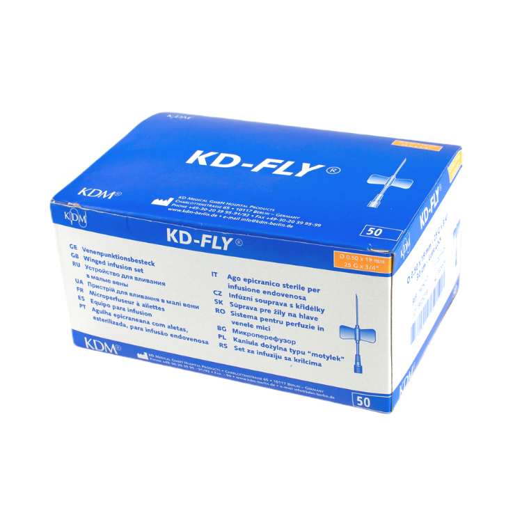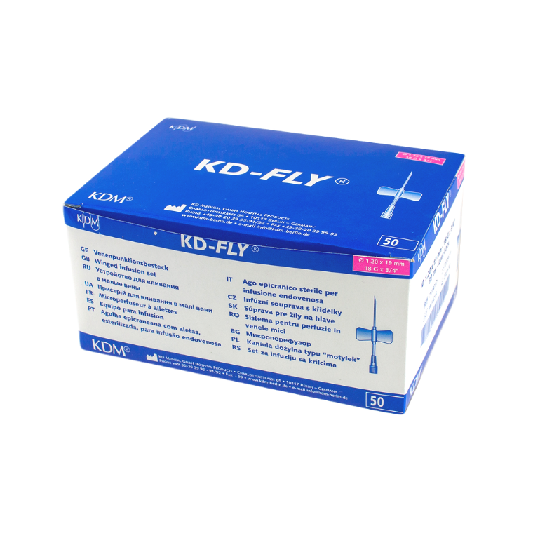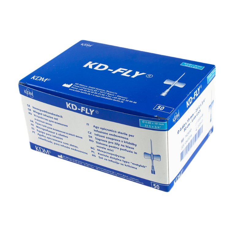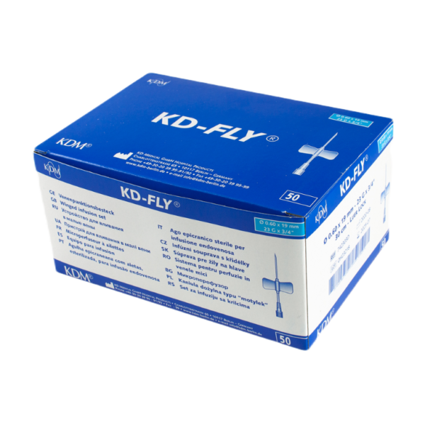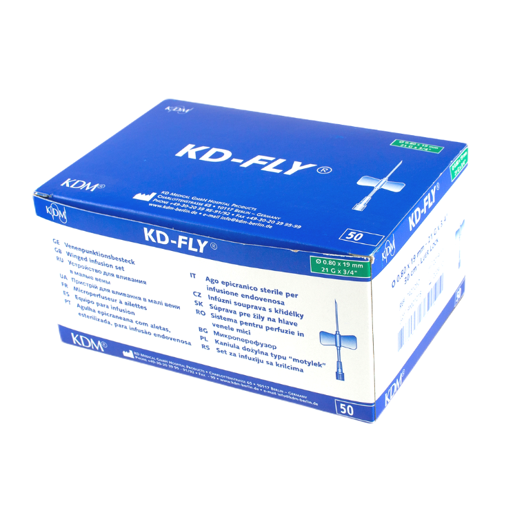 Prezentowana KD-Fly igła iniekcyjna typu motylek renomowanej firmy KD Medical dostępna jest w pięciu rozmiarach do wyboru: 23G – 0.6x19mm, 22G – 0.7x19mm, 21G – 0.8x19mm, 20G – 0.9x19mm, 19G – 1.1x19mm. Każda z nich znajduje się w opakowaniu typu blister w pudełku zbiorczym zawierającym po 50 sztuk produktu.