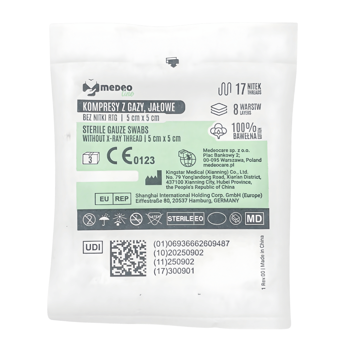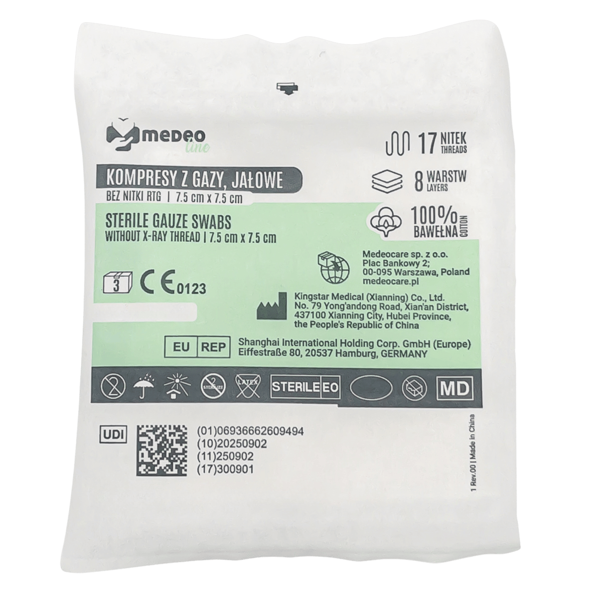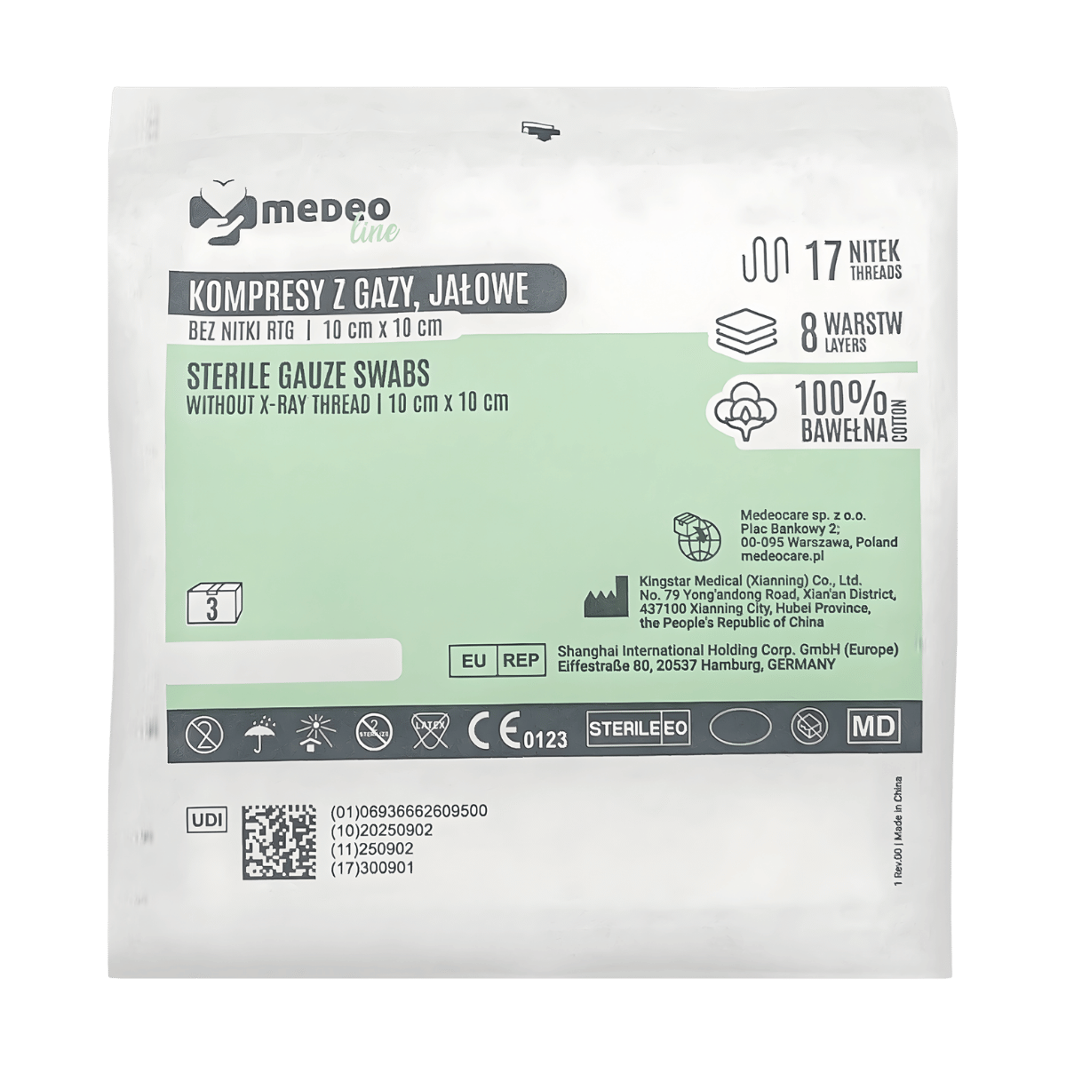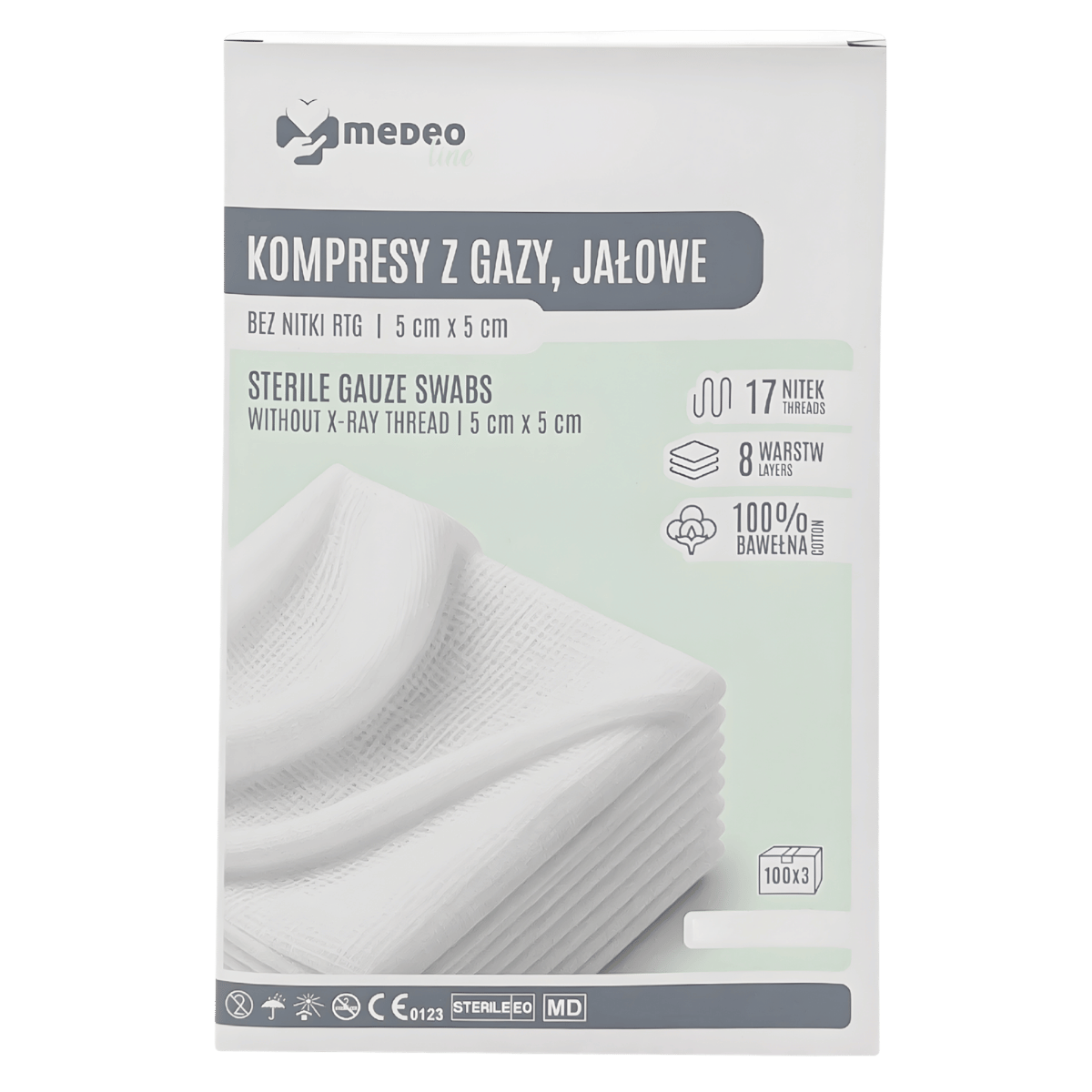 Jałowe kompresy z gazy MedeoLine to chłonny materiał opatrunkowy z 100% bawełny, przeznaczony do oczyszczania, osłaniania i tamponowania ran oraz do wchłaniania wysięku. Produkt jest sterylizowany EO i przeznaczony do jednorazowego użytku.