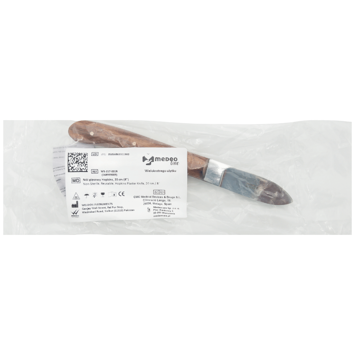 Nóż gipsowniczy typu Hopkins o długości 20 cm to narzędzie przeznaczone do pracy z opatrunkami gipsowymi w warunkach gabinetowych i zabiegowych. Produkt marki Medeoline wykonano z wysokostopowej stali chirurgicznej, co zapewnia trwałość oraz możliwość wielokrotnego użytkowania po prawidłowym przygotowaniu i sterylizacji.