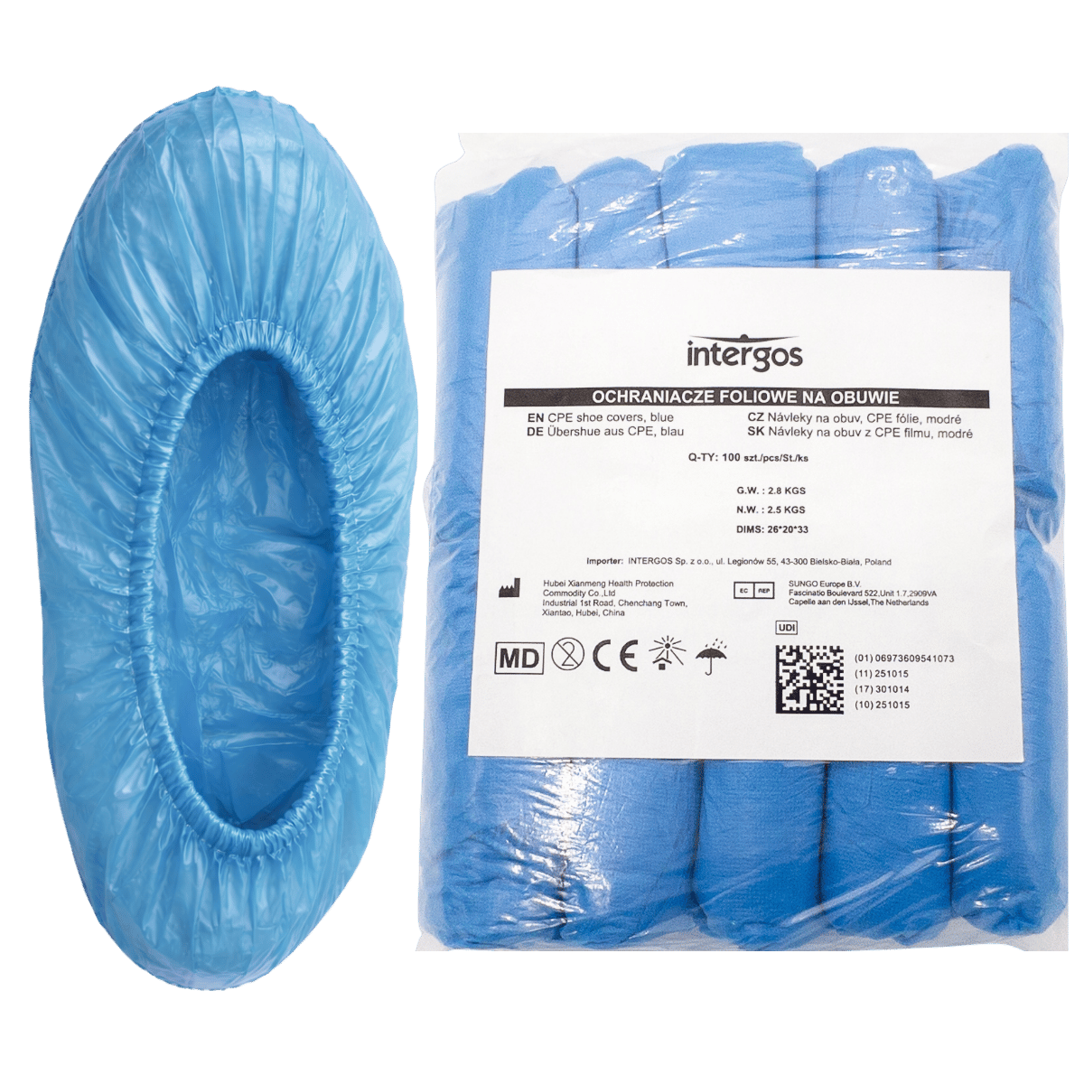 - 100 szt foliowych ochraniaczy na buty Intergos niejałowe, krótki fason, z gumką