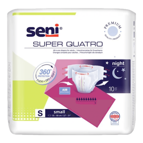 Ze względu na podwyższoną chłonność pieluchomajtki Seni Super Quatro rekomendowane są do użycia również w nocy.