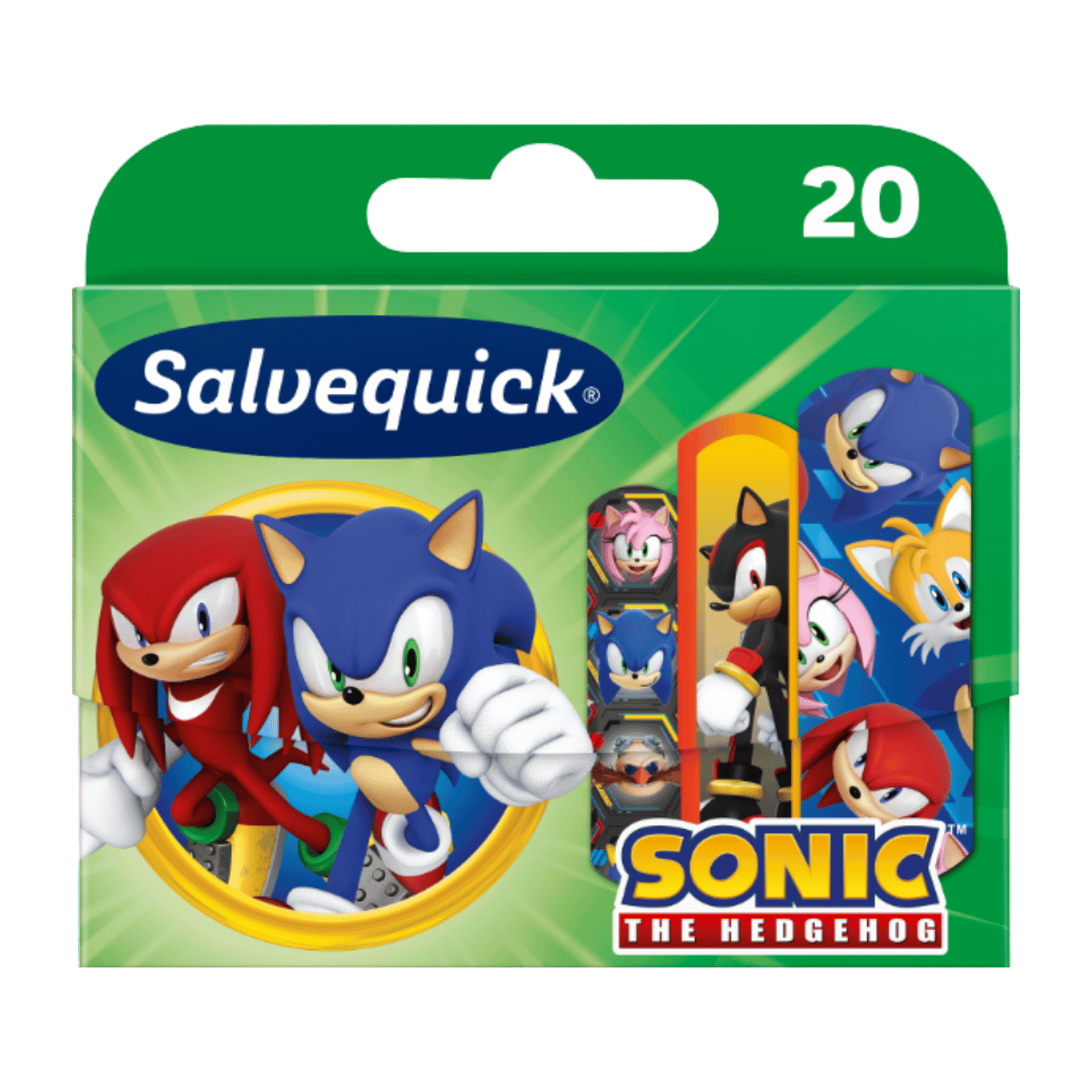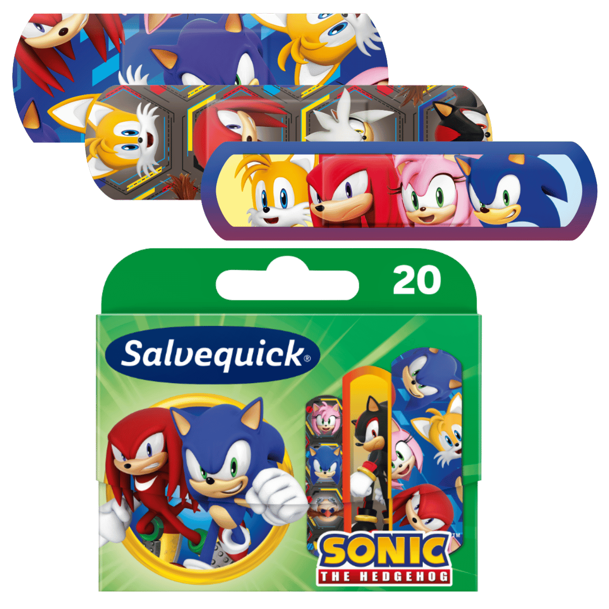 Te wodoodporne, oddychające plastry Salvequick Sonic powstały z myślą o małych poszukiwaczach przygód, którzy nie boją się przyspieszenia! Z Sonikiem, Tailsem, Amy, Knucklesem i Shadowem każda ranka goi się szybciej, a uśmiech wraca na twarz błyskawicznie – niczym po super turbo obrocie!