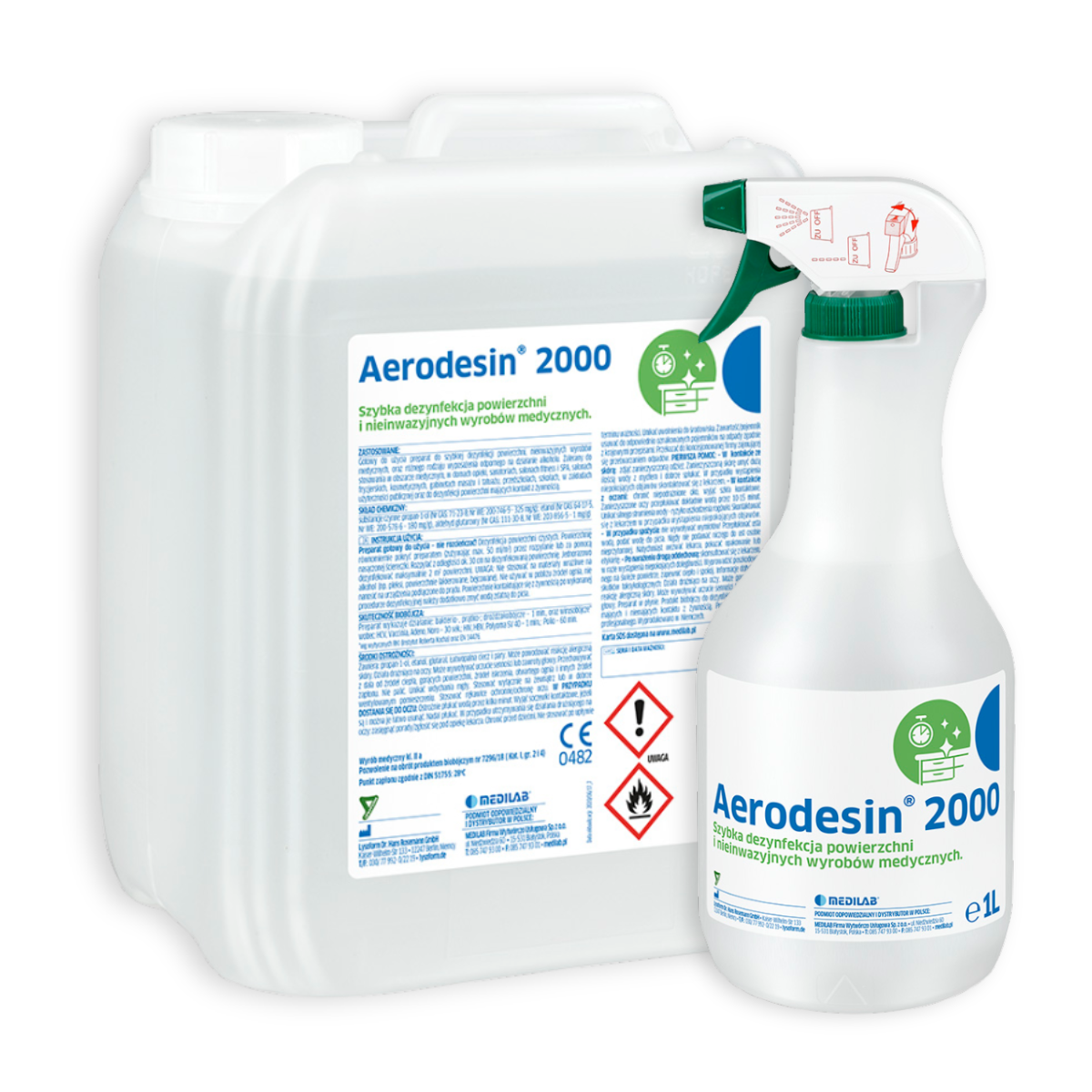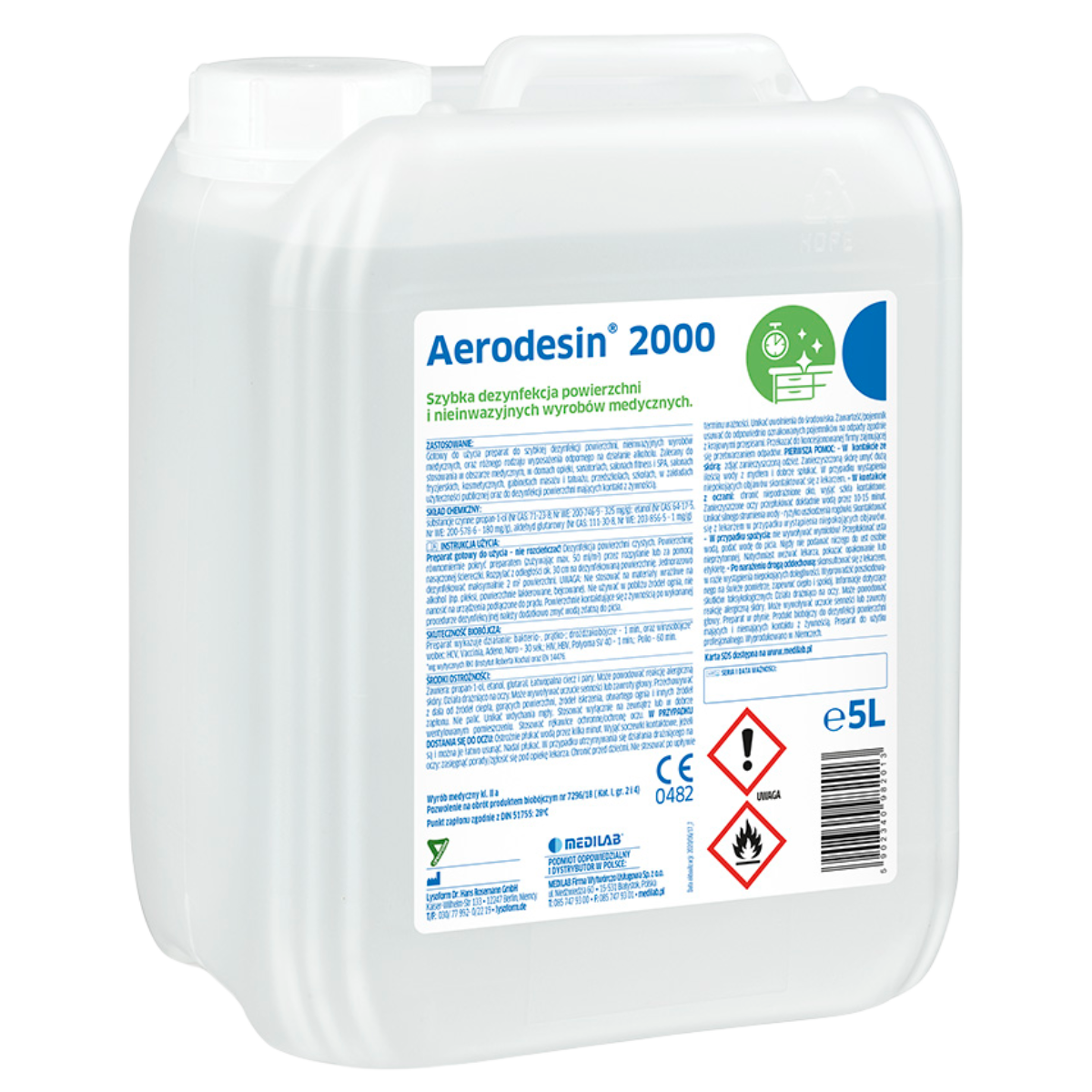 Aerodesin 2000 Medilab to profesjonalny, gotowy do użycia preparat do szybkiej dezynfekcji powierzchni oraz nieinwazyjnych wyrobów medycznych. Jego formuła oparta na alkoholu z dodatkiem glutaraldehydu zapewnia szerokie spektrum działania biobójczego już przy 1-minutowym czasie kontaktu. Dzięki wygodnej formie aplikacji – przez rozpylanie lub za pomocą ściereczki – jest szczególnie polecany w gabinetach medycznych, zabiegowych, stomatologicznych oraz w branży beauty i gastronomii.