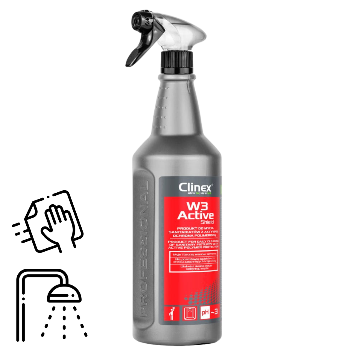 Clinex W3 Active Shield to kwaśny preparat (~pH 3) do codziennego mycia łazienek i sanitariatów. Nowoczesna formuła z polimerami ochronnymi skutecznie usuwa rdzawe i kamienne nacieki, osady wapienne, mydlane oraz codzienny brud, a jednocześnie tworzy warstwę anti-soil, która spowalnia ponowne osadzanie zanieczyszczeń i ułatwia kolejne mycie. Produkt posiada Świadectwo Jakości Zdrowotnej PZH.