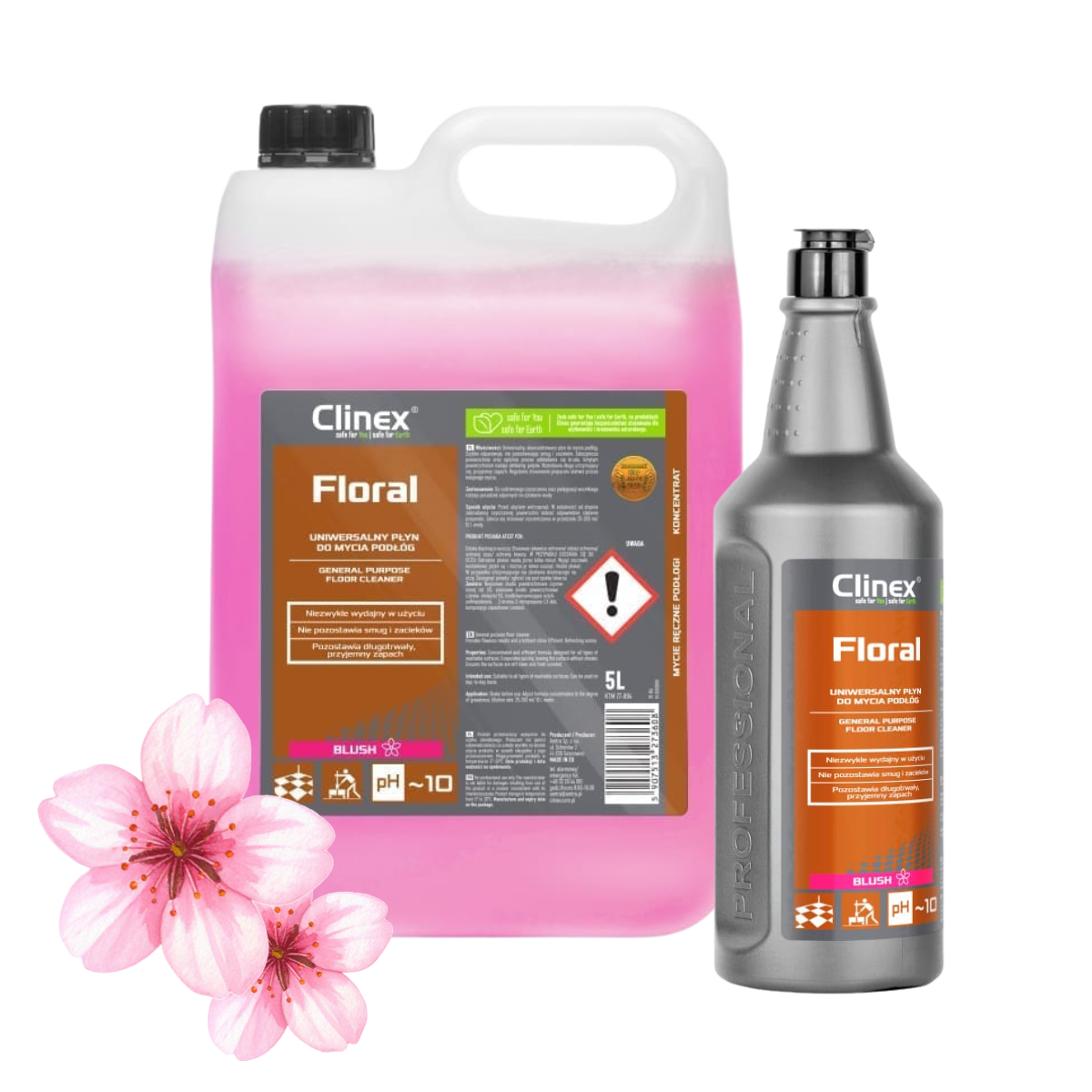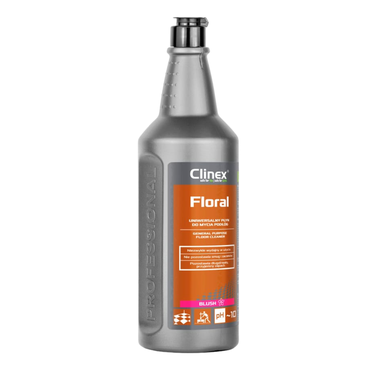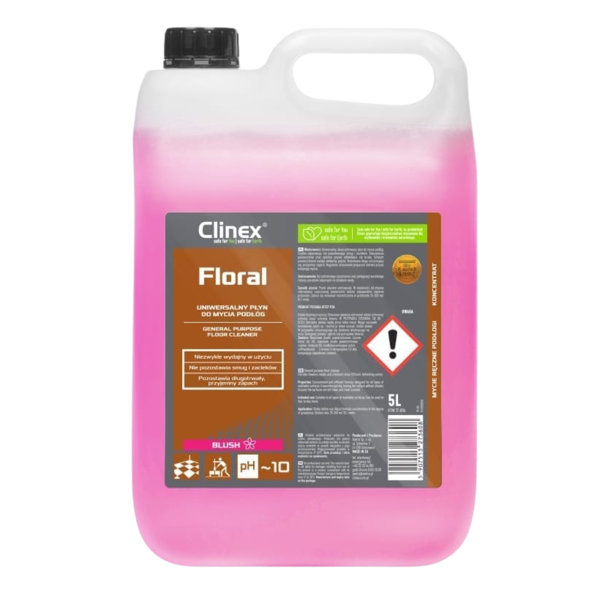 Clinex Floral Blush to skoncentrowany płyn do mycia podłóg o kompozycji kwiatowo-owocowej – zapach przywodzi na myśl wiosenny spacer po łące i utrzymuje się długo po sprzątaniu. Preparat szybko odparowuje, nie zostawia smug ani zacieków, nadaje powierzchniom delikatny połysk oraz opóźnia osadzanie się brudu, dzięki czemu kolejne mycie jest łatwiejsze i szybsze. Produkt przeznaczony do codziennej pielęgnacji posadzek odpornych na działanie wody w obiektach użyteczności publicznej i w domu.