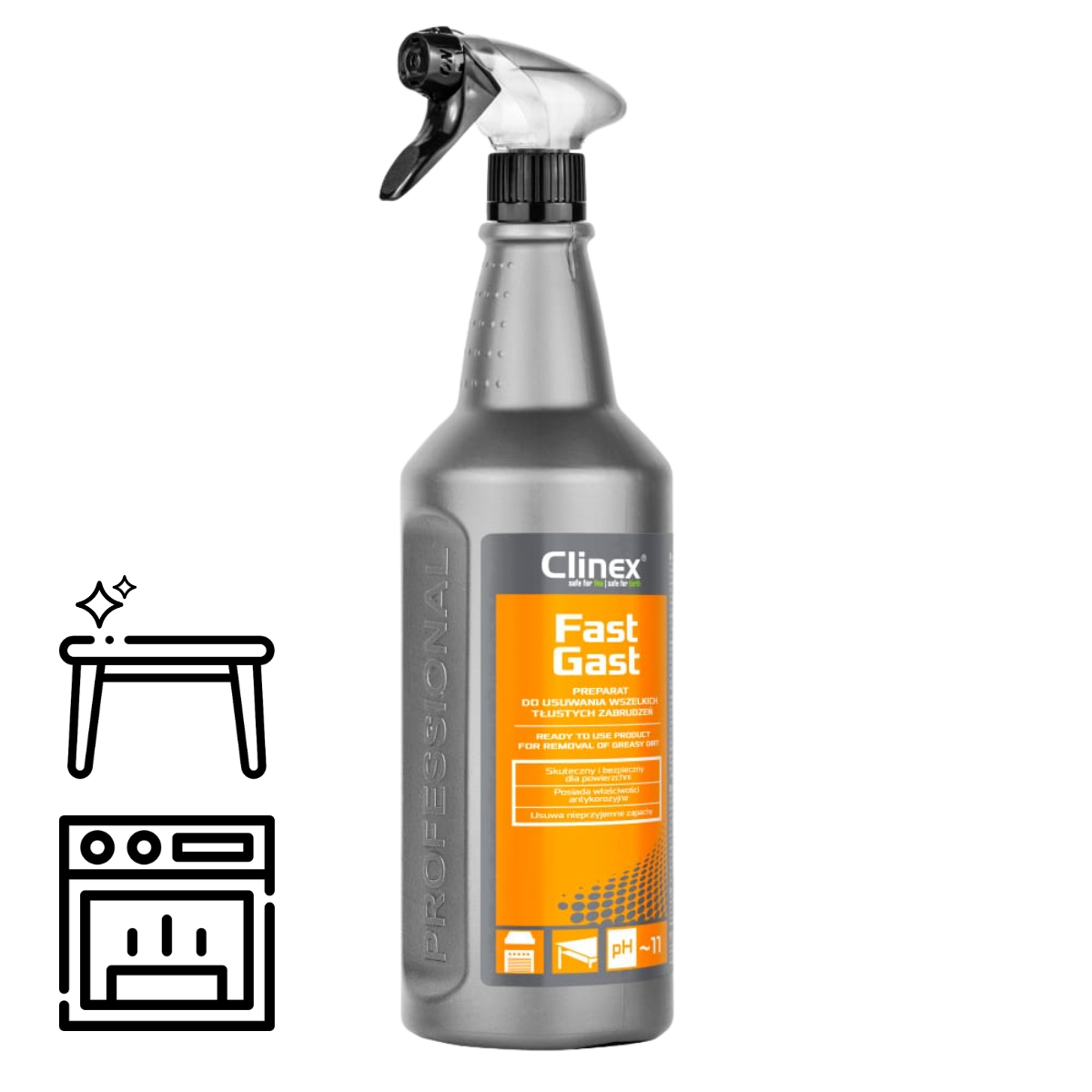 Clinex FastGast to gotowy do użycia środek do usuwania wszelkich zabrudzeń tłuszczowo-olejowych. Dzięki zdolności emulgowania tłuszczu skutecznie rozpuszcza przypalone resztki jedzenia i uporczywe naloty, nie pozostawiając smug ani zacieków. Posiada świeży zapach i Świadectwo Jakości Zdrowotnej PZH, co potwierdza bezpieczeństwo użytkowania w strefach przygotowania żywności.