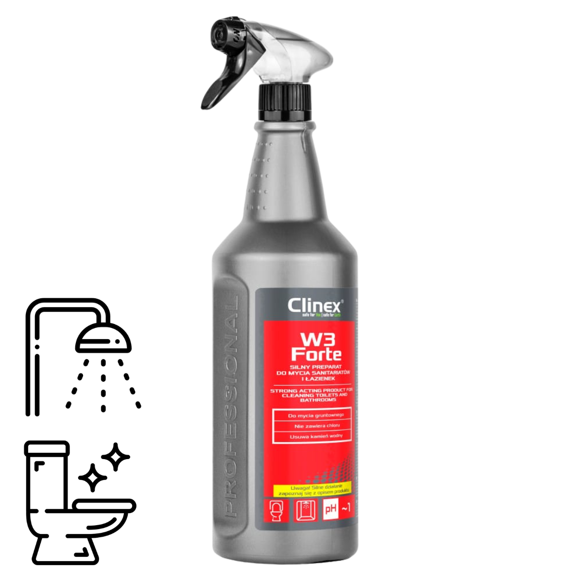 Clinex W3 Forte to kwaśny preparat (~pH 1) do gruntownego czyszczenia sanitariatów i łazienek. Działa na uporczywe zabrudzenia nieorganiczne: rdzę, kamień wodny, osady wapienne oraz resztki mydła. Może być stosowany na powierzchniach odpornych na działanie kwasów, szczególnie polecany do misek WC, pisuarów, bidetów, wanien, brodzików, umywalek, kabin prysznicowych, armatury, stali nierdzewnej, gresu, glazury, posadzek oraz spoin cementowych. Likwiduje nieprzyjemne zapachy urynowe, dzięki czemu sprawdza się w obiektach o wysokim standardzie czystości (np. hotele, apartamenty).