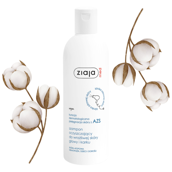 - Szampon oczyszczający AZS Ziaja MED służy do codziennej higieny włosów, skóry głowy i karku dla osób w każdym wieku z atopią skóry.